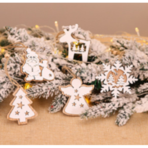 Set 5 decoratiuni de Craciun, din lemn, cu sistem de agatare in Brad